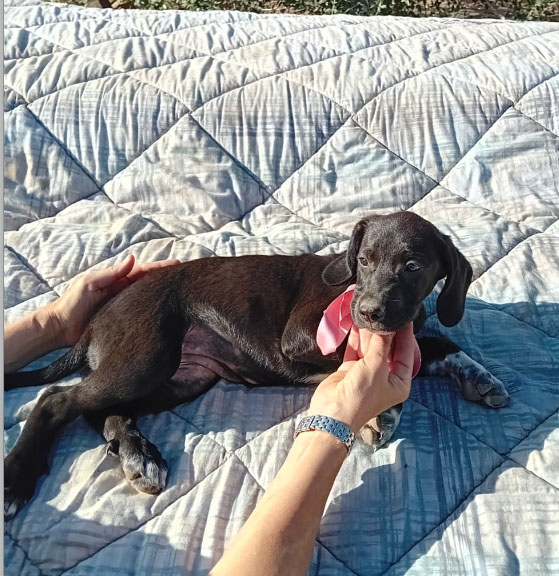Karla è una cucciola di 90 giorni, futura taglia media, incrociata con un Pointer.