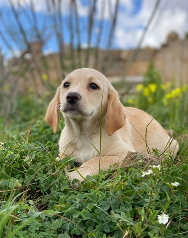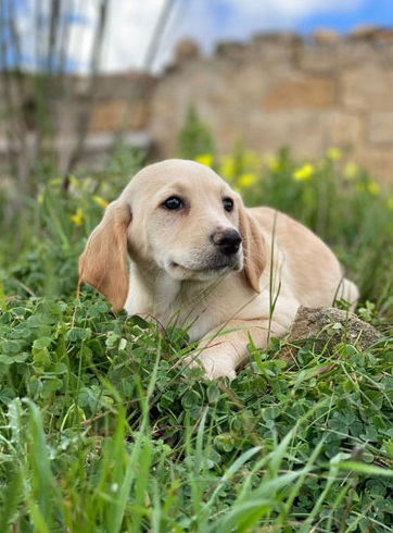 Monalisa è una cucciola di 65 giorni, futura taglia medio contenuta, incrociata con un Segugio.