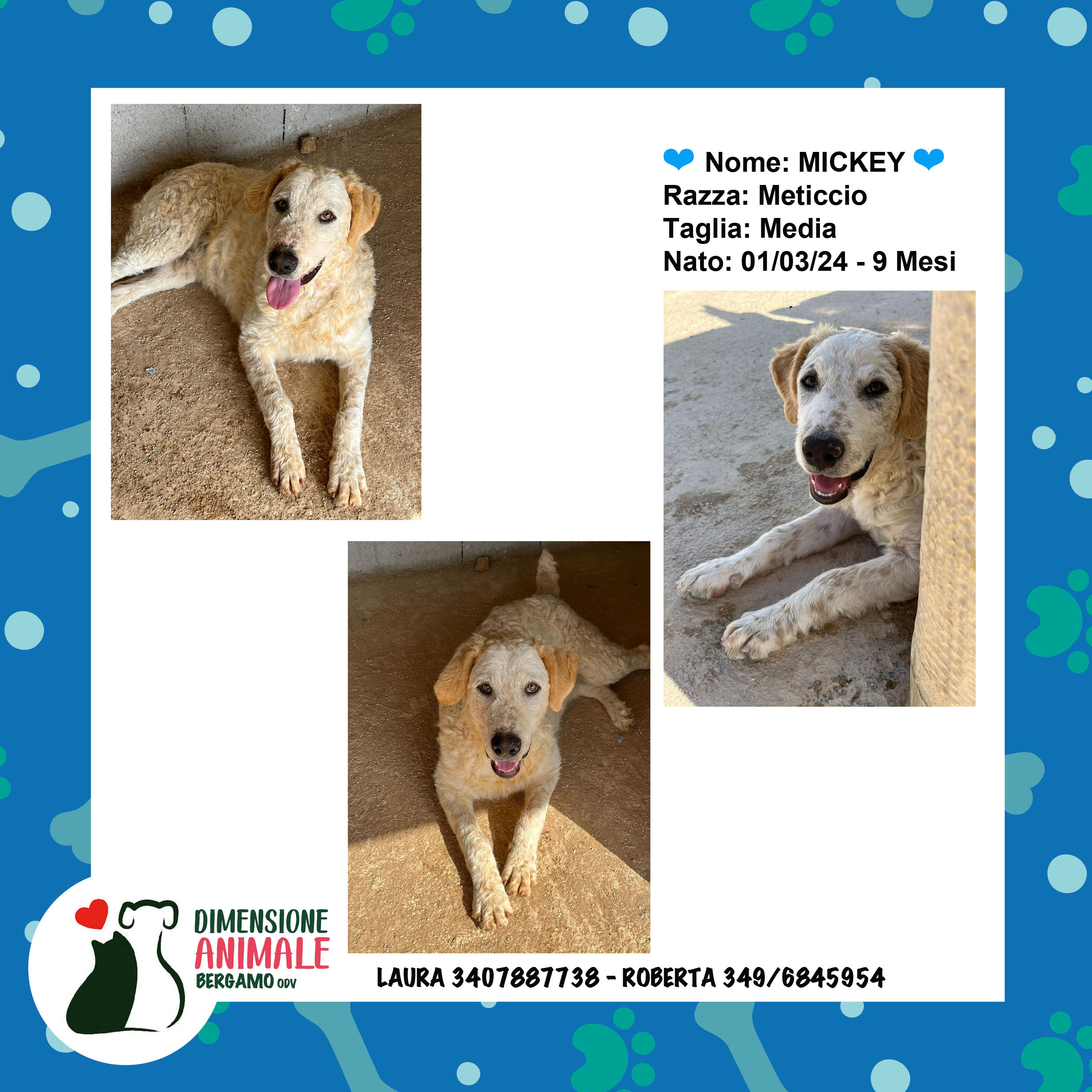 Mickey è davvero dolcissimo, giocherellone, sempre in cerca di coccole, adatto a famiglie con bambini, ben socializzato con l’uomo e con i suoi simili.